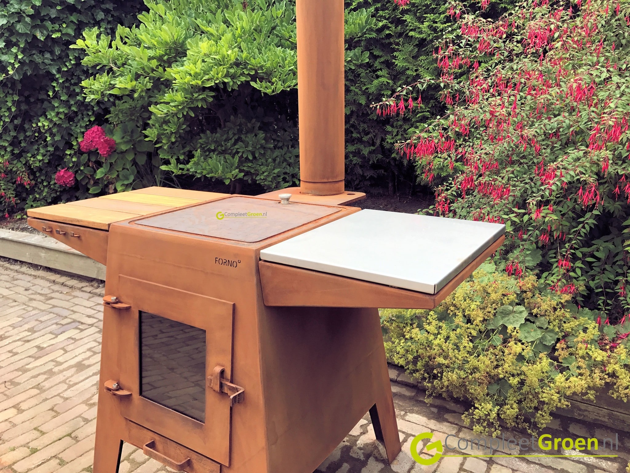 De Forno kan door zijn cortenstaal kan hij het hele jaar buiten blijven staan.