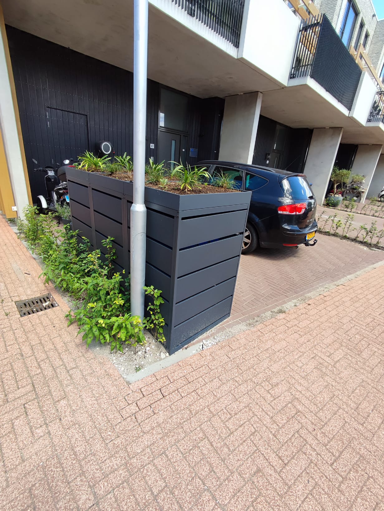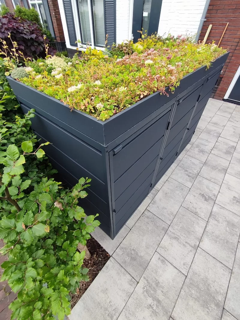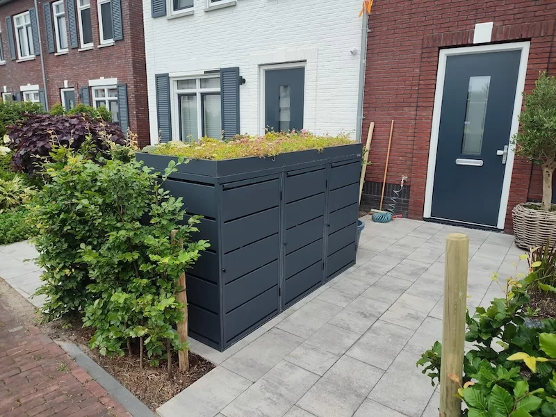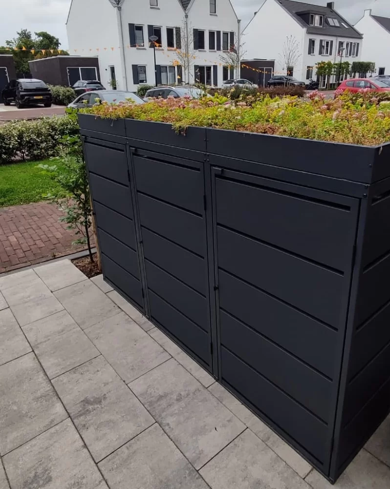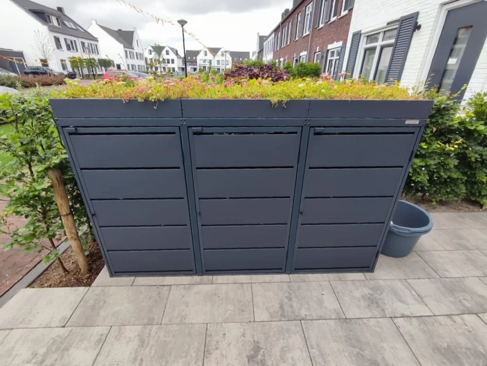 De Green Plant Grey Ombouw heeft een moderne natuurlijke uitstraling. Met zijn strakke lijnen en groendak worden de containers netjes verborgen. De ombouw is stevig en onderhoudsvriendelijk. De deuren hebben een antracietgrijze kleur. Met zijn rustige uiterlijk is deze populaire ombouw een verrijking voor uw tuin.