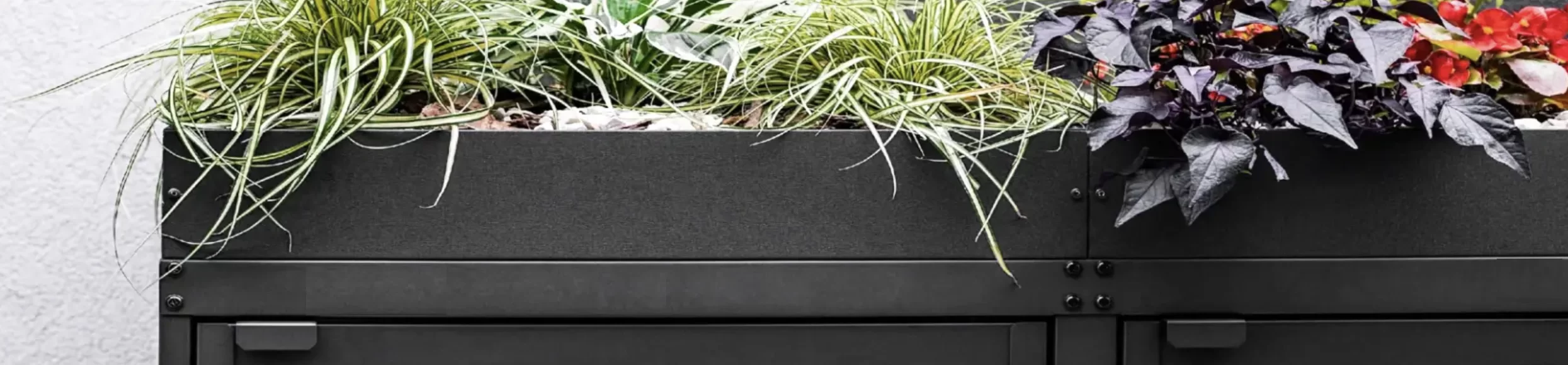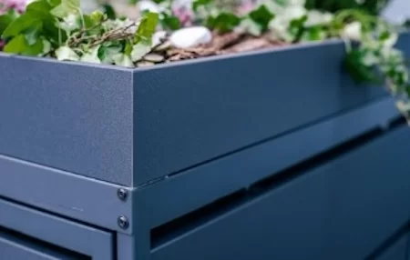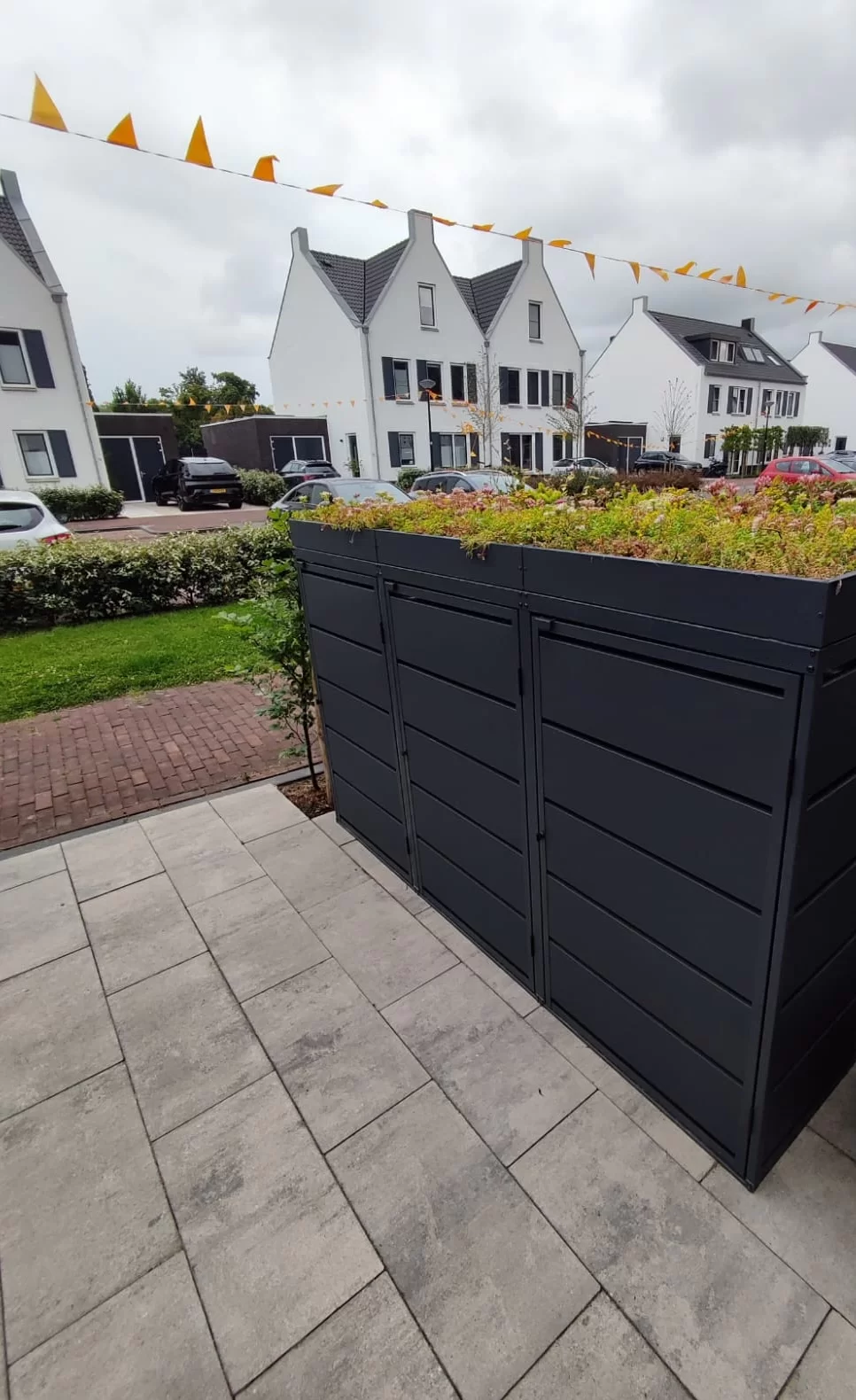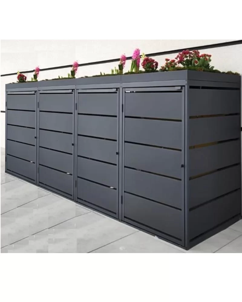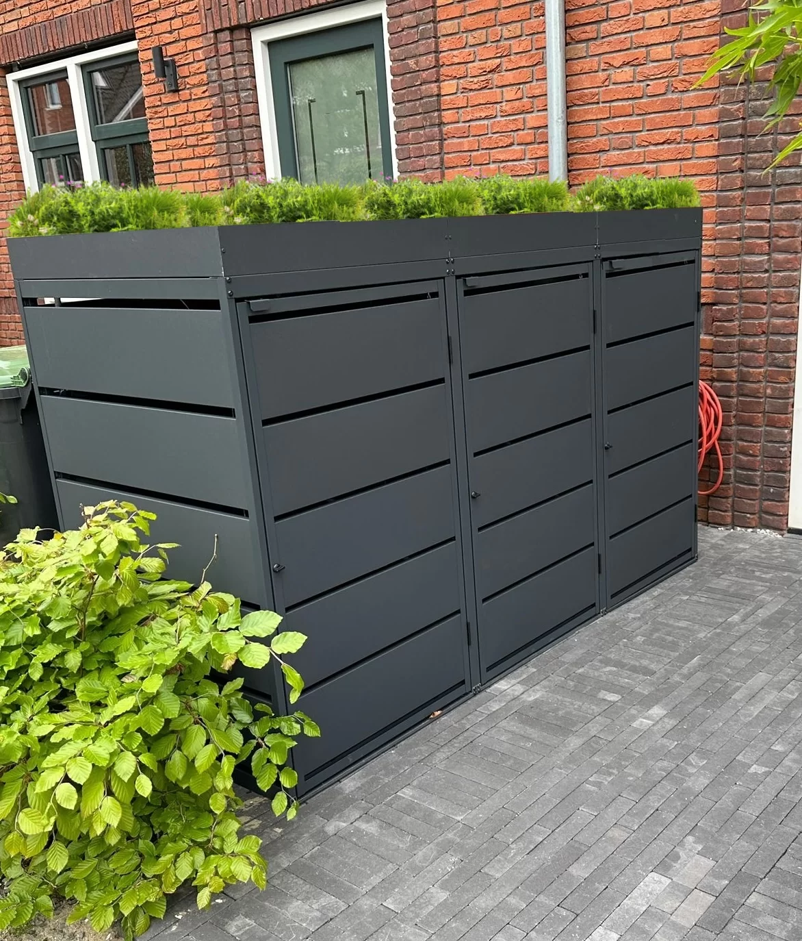 De Green Plant Grey Ombouw heeft een moderne natuurlijke uitstraling. Met zijn strakke lijnen en groendak worden de containers netjes verborgen. De ombouw is stevig en onderhoudsvriendelijk. De deuren hebben een antracietgrijze kleur. Met zijn rustige uiterlijk is deze populaire ombouw een verrijking voor uw tuin.