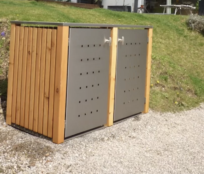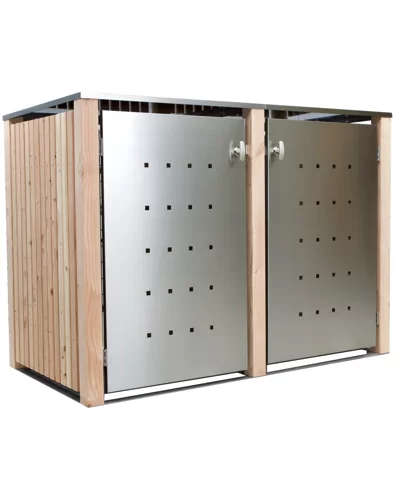 De Jille ombouw is een prachtige combinatie van douglas hout en RVS. Het geeft een natuurlijke en fraaie uitstraling die perfect geschikt is om een tuin te verfraaien. Het Douglas hout wordt gebruikt voor de palen op de hoeken en de zij- en achterkant(en) en is wordt beschouwd als zeer weersbestendig. Om roest te voorkomen, zijn de overige delen (scharnieren, dak enz.) gemaakt van RVS. Dankzij deze eigenschappen is de ombouw zeer solide en weersbestendig. De ombouw beschikt over een praktische handgreep en een stevige stabiele deur van gepolijst RVS.