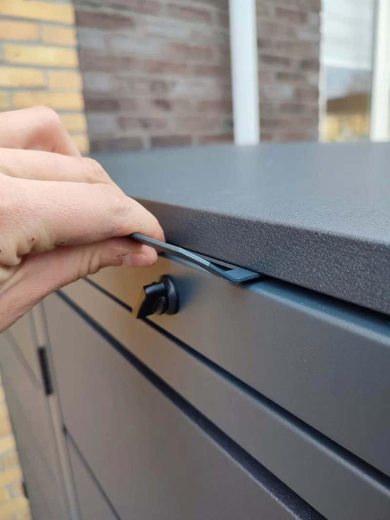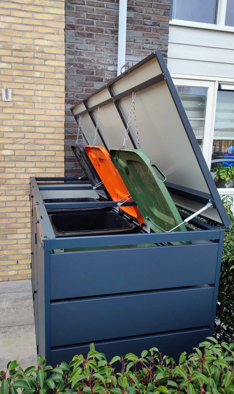 De twee deksels hebben twee gasveren en een ketting om de deksel van de kliko aan vast te maken