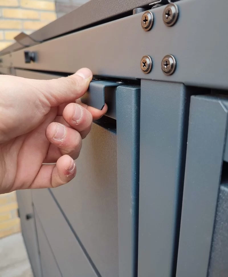 Zowel de deuren als de deksels zijn te sluiten (bij harde wind) met een zwarte draaiknop
