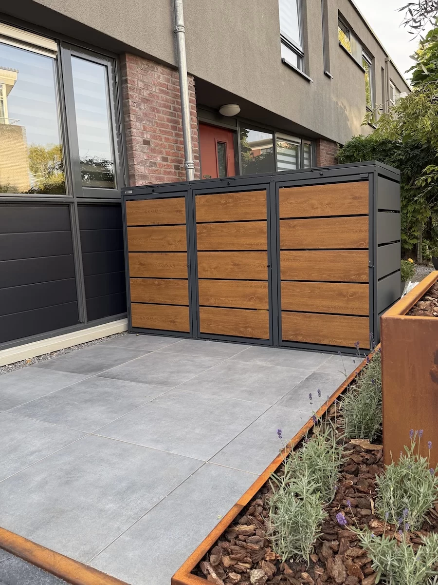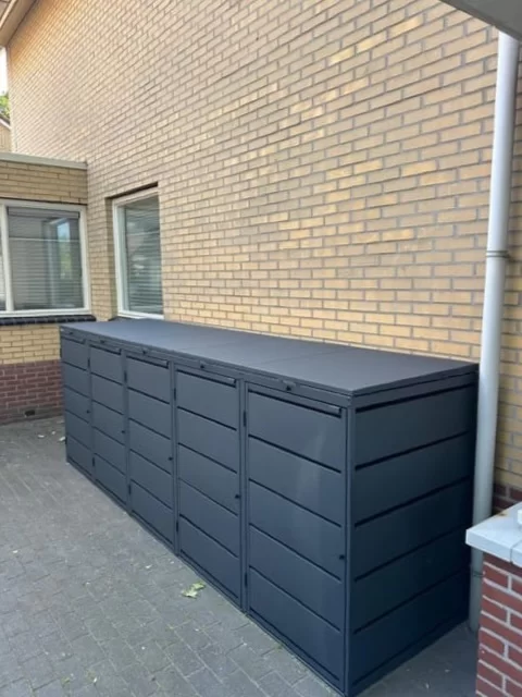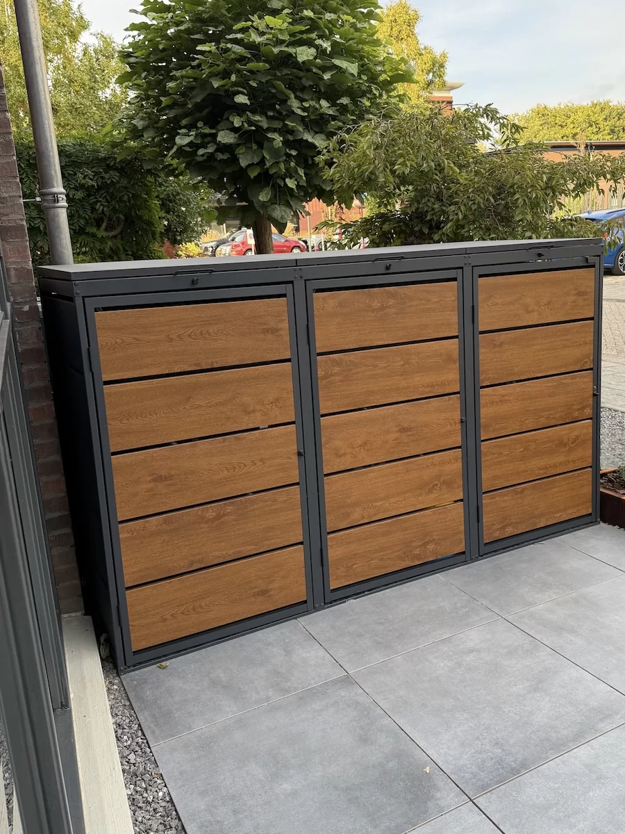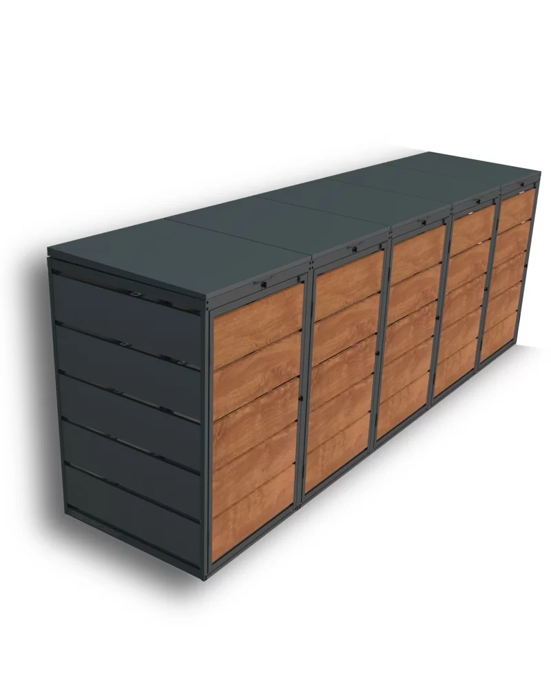 De Kuba Store is een praktische ombouw. Een populaire ombouw om vijf afvalcontainers te verstoppen. De ombouw heeft twee gasveren per deksel en is gemaakt van verzinkt staal dat is gepoedercoat in RAL 7016 Antracietgrijs, de deuren hebben een poedercoating in Eiken hout, je kunt de houtnerf voelen! Een natuurlijk gezicht zonder hout dat vergrijst, kromtrekt of gaat rotten.