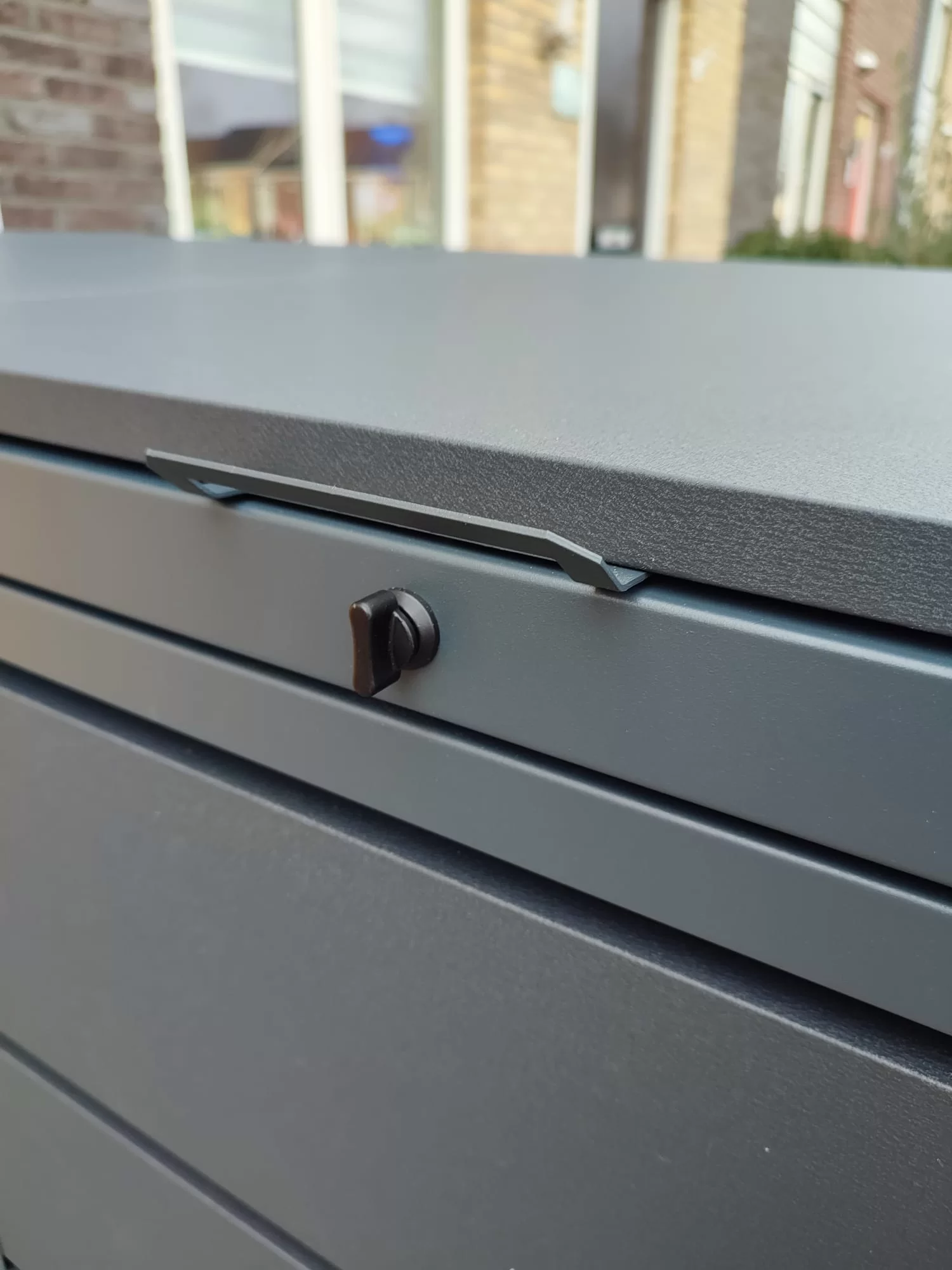 Het frame is gepoedercoat in Gitzwart (RAL9005), de deksel en lamellen zijn gepoedercoat in Metallic Zwart (92% RAL9005)