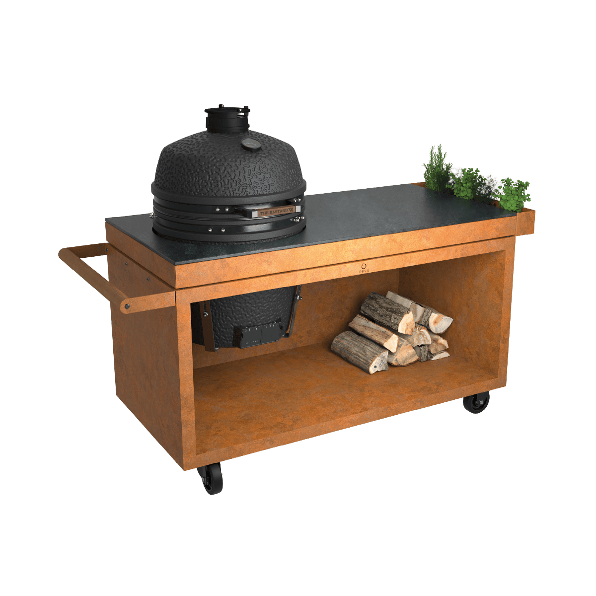 Met het verstelbare nest is deze tafel geschikt voor diverse kamado’s, waaronder The Bastard Urban Large en The Bastard VX. De tafel is gemaakt van duurzaam Cortenstaal en is voorzien van een keramisch werkblad.