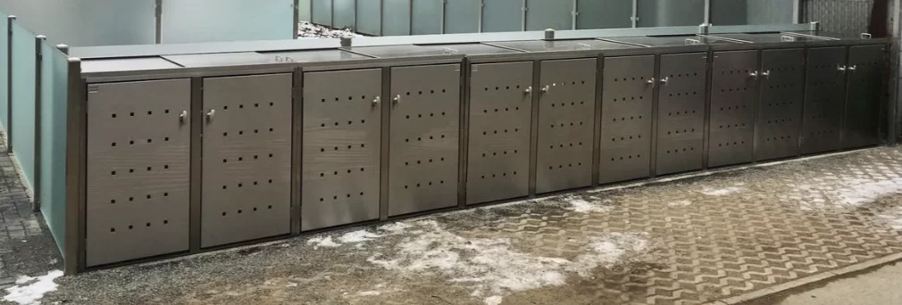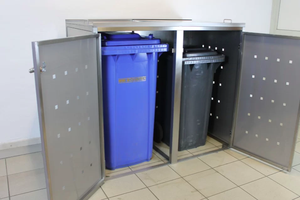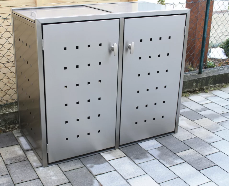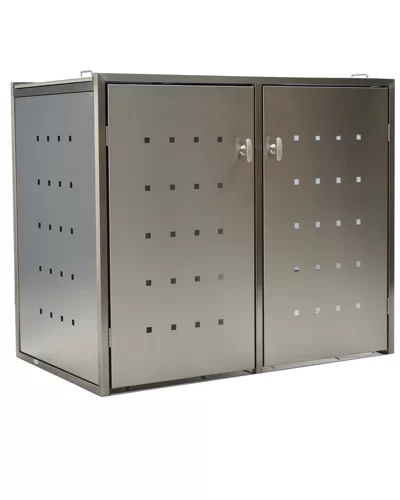 Geschikt voor twee kliko’s/containers van 140 of 240 liter. Maximale grootte kliko van B 58 x D 74,5 x H 119 cm. (Deze kliko’s/containers passen in de ombouw.)