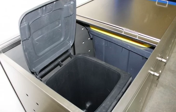 De ombouw heeft een schuifdeksel en is ruimtebesparend. De schuifdeksel kan eenvoudig naar rechts of links worden geschoven. De deurscharnieren zijn standaard links en rechts gemonteerd, zodat de handvaten in het midden uitkomen (deze kunnen ook worden voorzien van een slot).
