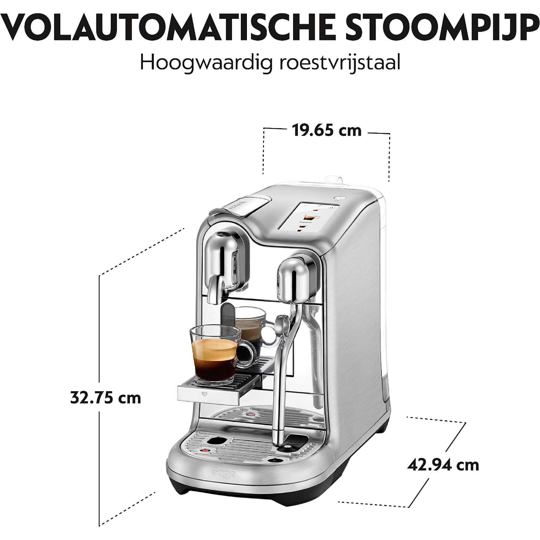 Deze prachtige espressomachine van Sage heeft een stijlvol design dat een plekje in elke keuken verdient. Dankzij de zilverkleurige afwerking in roestvrij staal heeft deze Sage een luxueuze, professionele uitstraling. Jij doet gewoon een capsule in de machine en past vervolgens de instellingen aan. Met 7 koffie- en heetwatervolumes, 8 melkschuimniveaus en 11 melktemperaturen is er voor iedere koffieliefhebber wat wils. Bovendien heeft het apparaat aparte pijpen voor koffie en heet water, waardoor jij geniet van pure smaken of eenvoudig een Long Black maakt. Ook heeft het apparaat een opvangbakje voor gebruikte capsules en een groot waterreservoir van 2 liter.