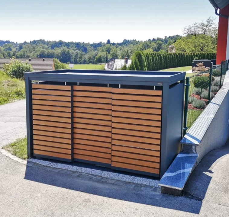 Drievoudige behuizing voor drie 240 liter kliko’s/containers met beplantbaar dak. Het frame is gemaakt van vierkante kokers (6 x 6 cm), beschikt over een achterkant en zijwanden, lamellen deuren en vanglijnen voor comfortabele bediening van de containers en beplantbaar dak (hoogte 6 cm) van aluminium. De schuifdeur heeft borstels in de schuifdeur ophanging voor bescherming tegen vuil en stof. De ombouw heeft geen tussenschot, waardoor er meer ruimte in de ombouw ontstaat.