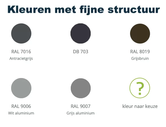 Alle metalen onderdelen zijn verzinkt en gepoedercoat. Alle aluminium onderdelen zijn gepoedercoat. De poedercoating kan in verschillende kleuren worden aangebracht. Als kleur voor het Frame, Dak, Zijkanten en Achterkant kan worden gekozen: