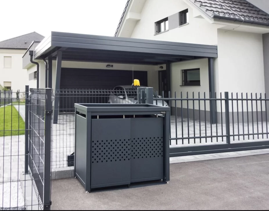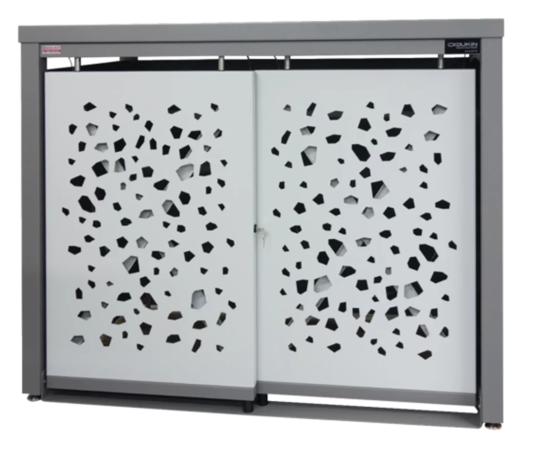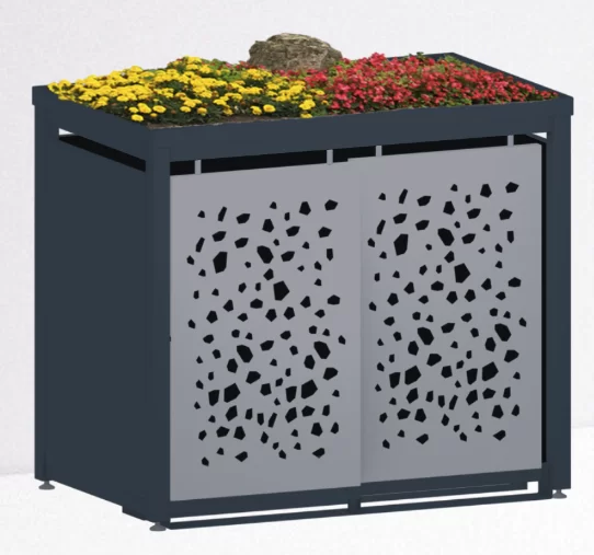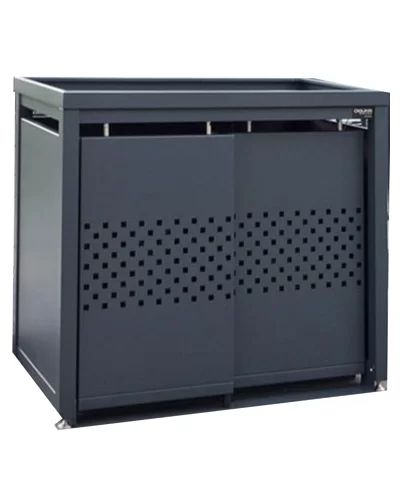 Dubbele behuizing voor twee 240 liter kliko’s/containers met beplantbaar dak. Het frame is gemaakt van vierkante kokers (6 x 6 cm), beschikt over een achterkant en zijwanden, lamellen deuren en vanglijnen voor comfortabele bediening van de containers en beplantbaar dak (hoogte 6 cm) van aluminium. De schuifdeur heeft borstels in de schuifdeur ophanging voor bescherming tegen vuil en stof. In de ombouw zit geen tussenschot.