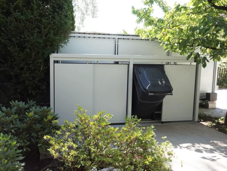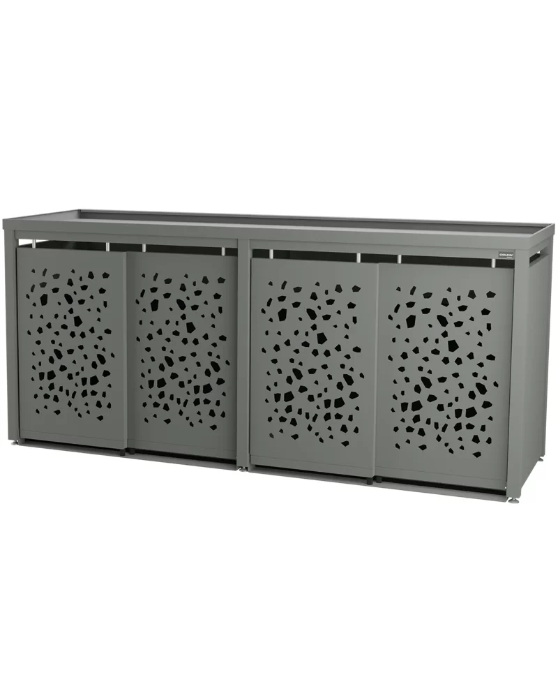 Viervoudige behuizing voor vier 240 liter kliko’s/containers met beplantbaar dak. Het frame is gemaakt van vierkante kokers (6 x 6 cm), beschikt over een achterkant en zijwanden, lamellen deuren en vanglijnen voor comfortabele bediening van de containers en beplantbaar dak (hoogte 6 cm) van aluminium. De schuifdeur heeft borstels in de schuifdeur ophanging voor bescherming tegen vuil en stof. In de ombouw zit geen tussenschot.